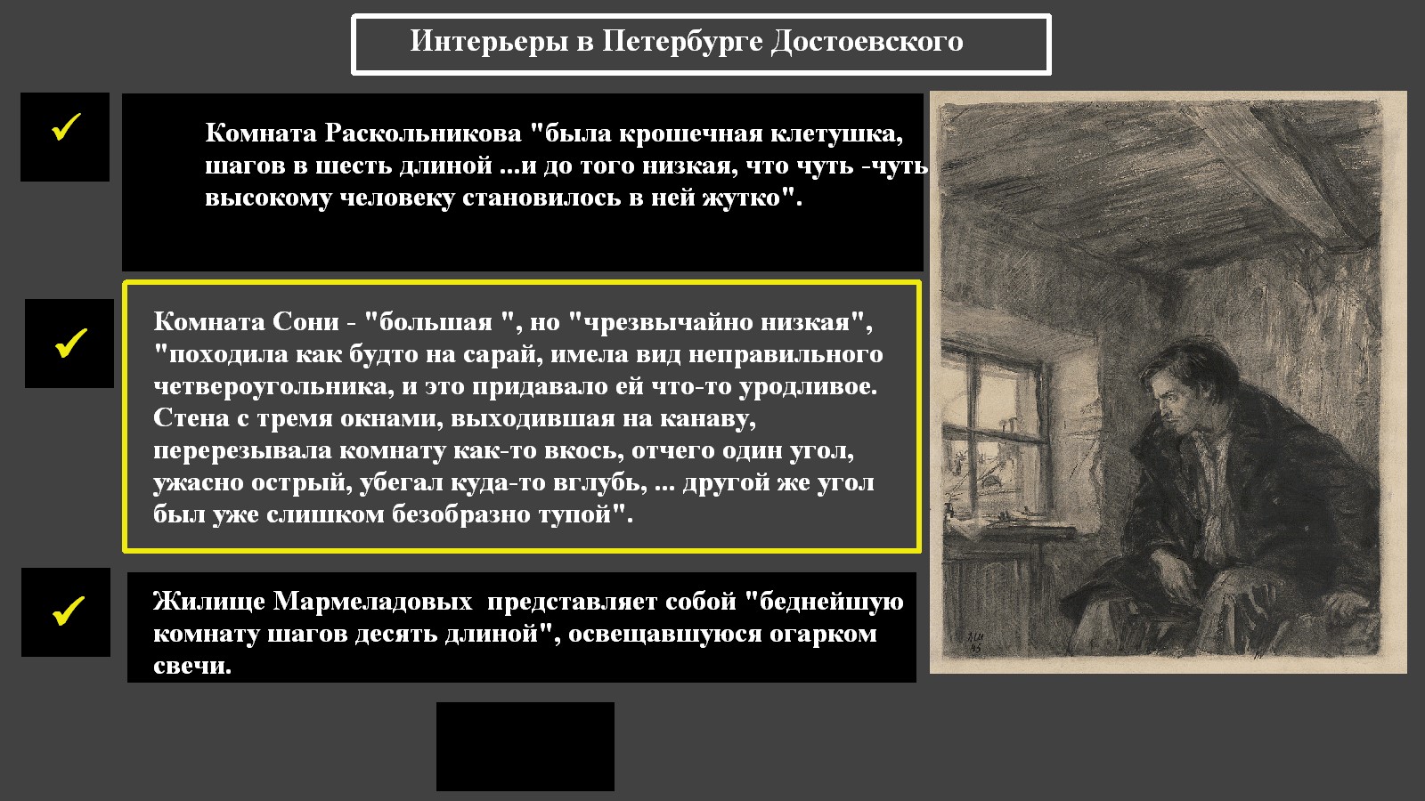 Город, изображенный писателем, бесчеловечен, враждебен людям. Уже первая фраза романа – своего рода зерно, заключающее в себе многие зачатки смысла… Каморка Раскольникова, которую он «нанимал от жильцов», похожая не то на шкаф, не то на гроб, - символ крайней неустроенности героя, У него не только нет своего жилья, но он нанимает у тех, кто сам снимает. Апофеоз бездомности. Так же живут другие персонажи романа. Детали описания комнат помогают почувствовать атмосферу духоты, тесноты, безысходности, в которой живут герои. Жилище Сони так убого, что даже Раскольников скажет ей: «Я бы в вашей комнате по ночам боялся». Каморка-шкаф- конура-гроб-угол – вот среда обитания героев. «Здесь нельзя ни встать, ни как следует дышать, а лишь одно положение может занимать персонаж – горизонтальное… Поэтому бегут они, притягиваемые неведомой силой в какую-то только им известную точку пути».
