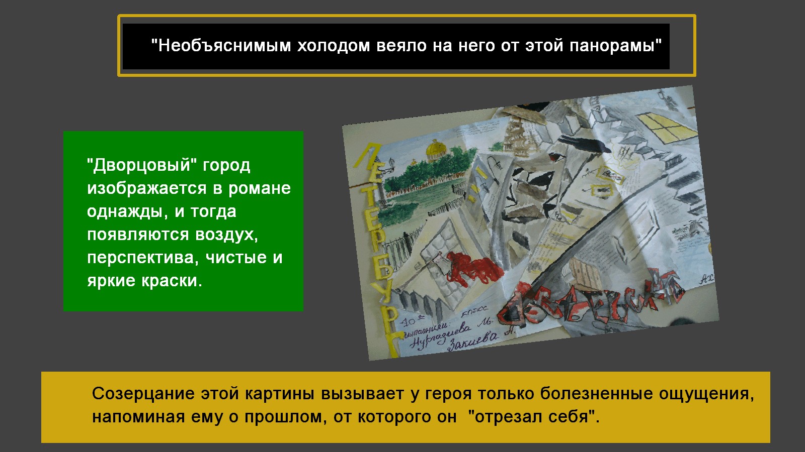 Тема Петербурга связана с главной темой романа – темой преступления. Именно в этом городе Раскольников попал под «наваждение» своей теории. А его духовное выздоровление начнется вдали от Петербурга.