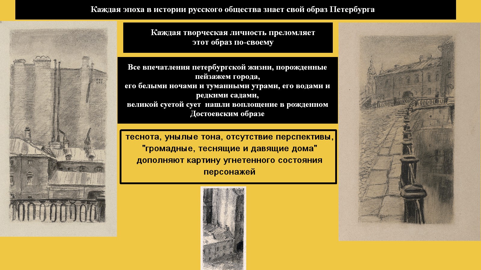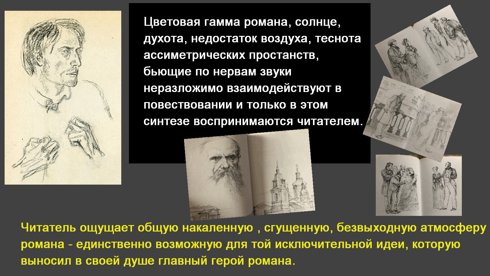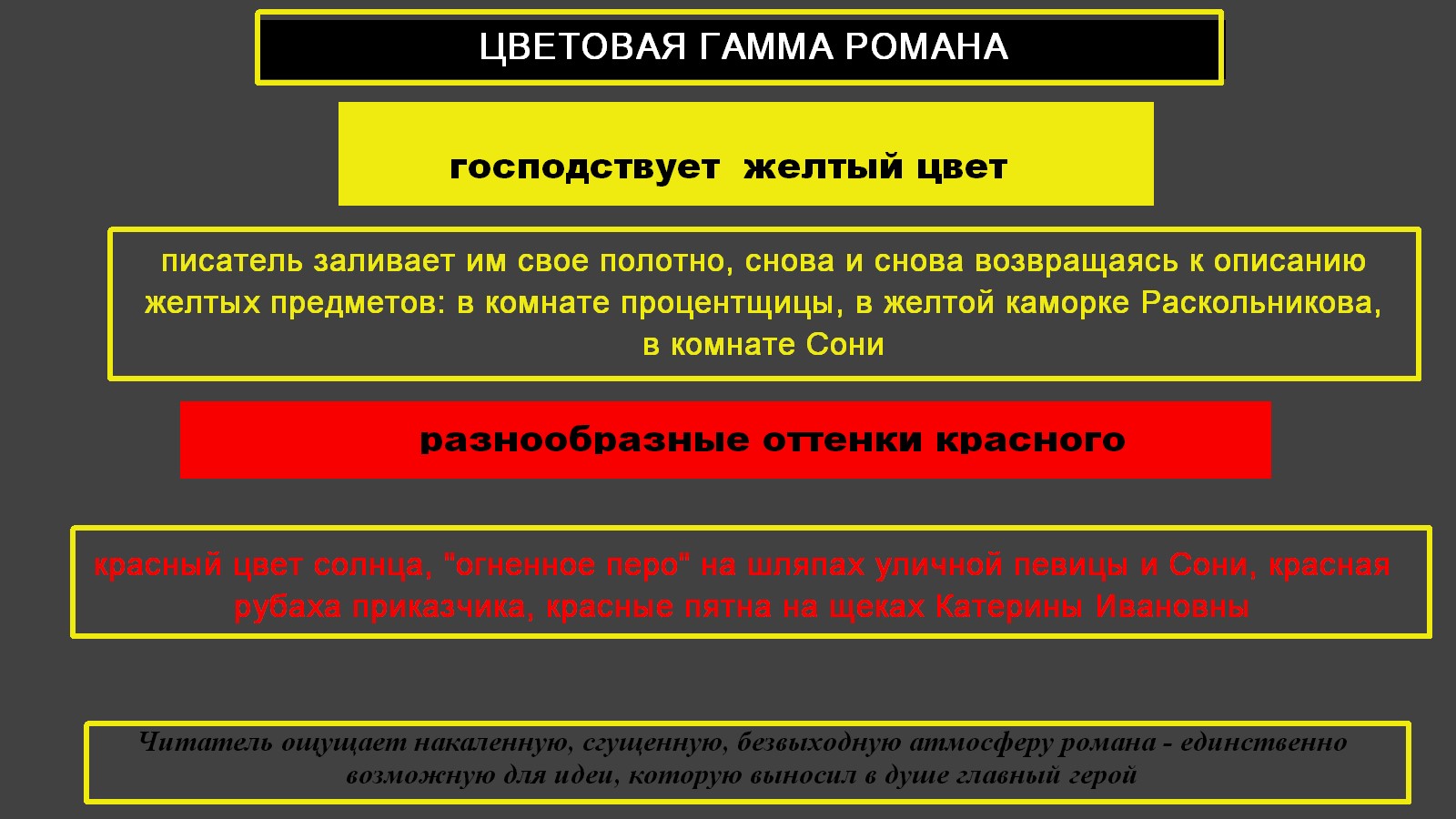 Достоевский редко использует цветовые определения. Поэтому постоянное упоминание о господстве желтого цвета в описании Петербурга не случайно. Роман создан с использованием фактически одного цвета. Желтый фон – великолепное дополнение к драматическим переживаниям героев. Он усиливает атмосферу нездоровья, надрыва, болезненности. На создание такой атмосферы «работает» и слово вдруг.