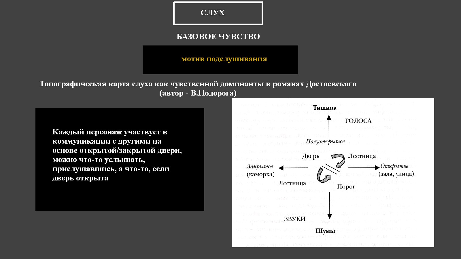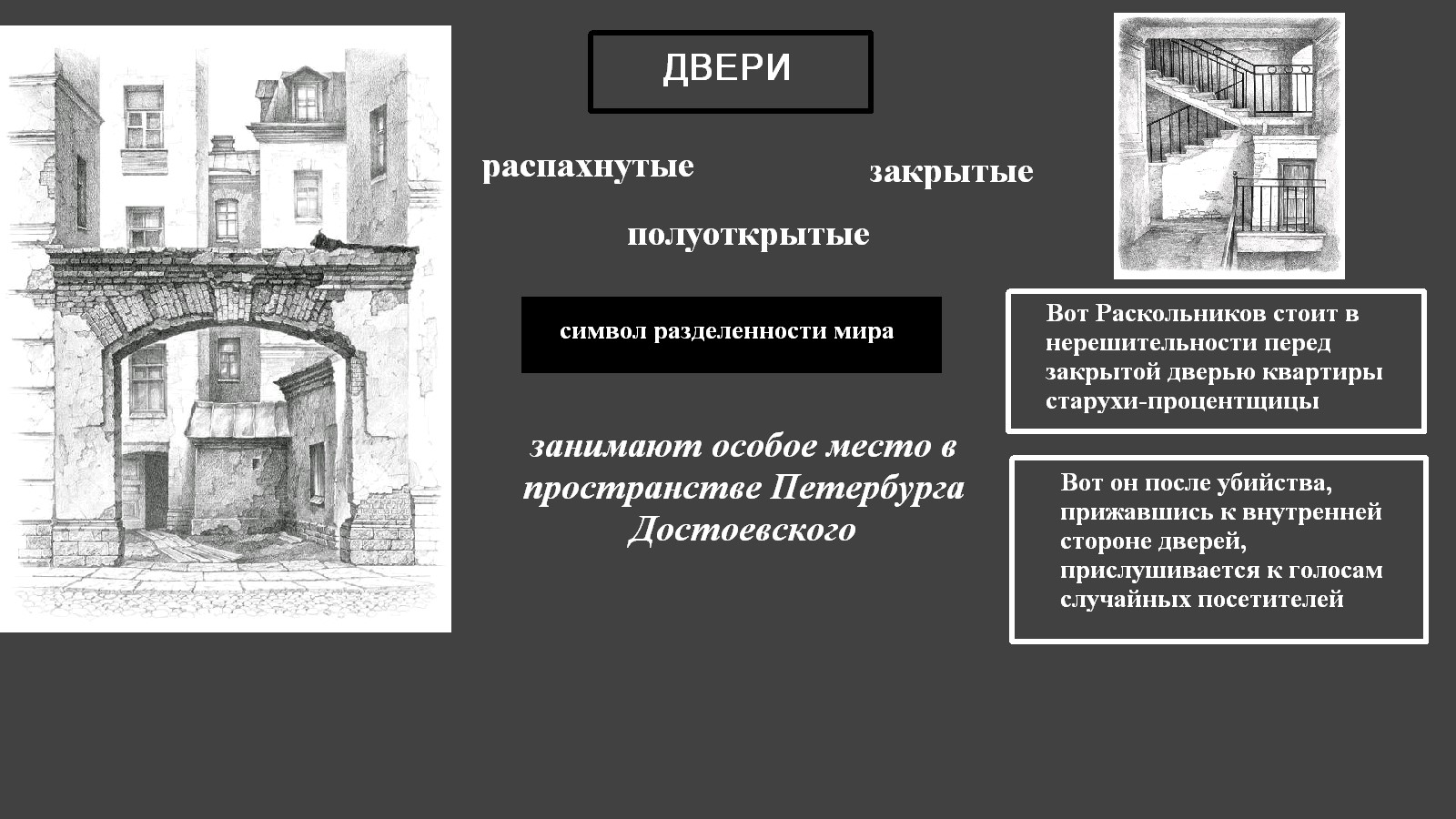 В организации пространства Петербурга Достоевского двери занимают особое место. Дверей много: они открываются и закрываются, какие-то заколочены наглухо или просто закрыты. «Принцип закрытой двери и есть основной принцип пространственной упаковки событийного ряда в литературе Достоевского. Закрытая дверь – граница между слышимым и неслышимым; человеческие связи прерваны». (В.Подорога).