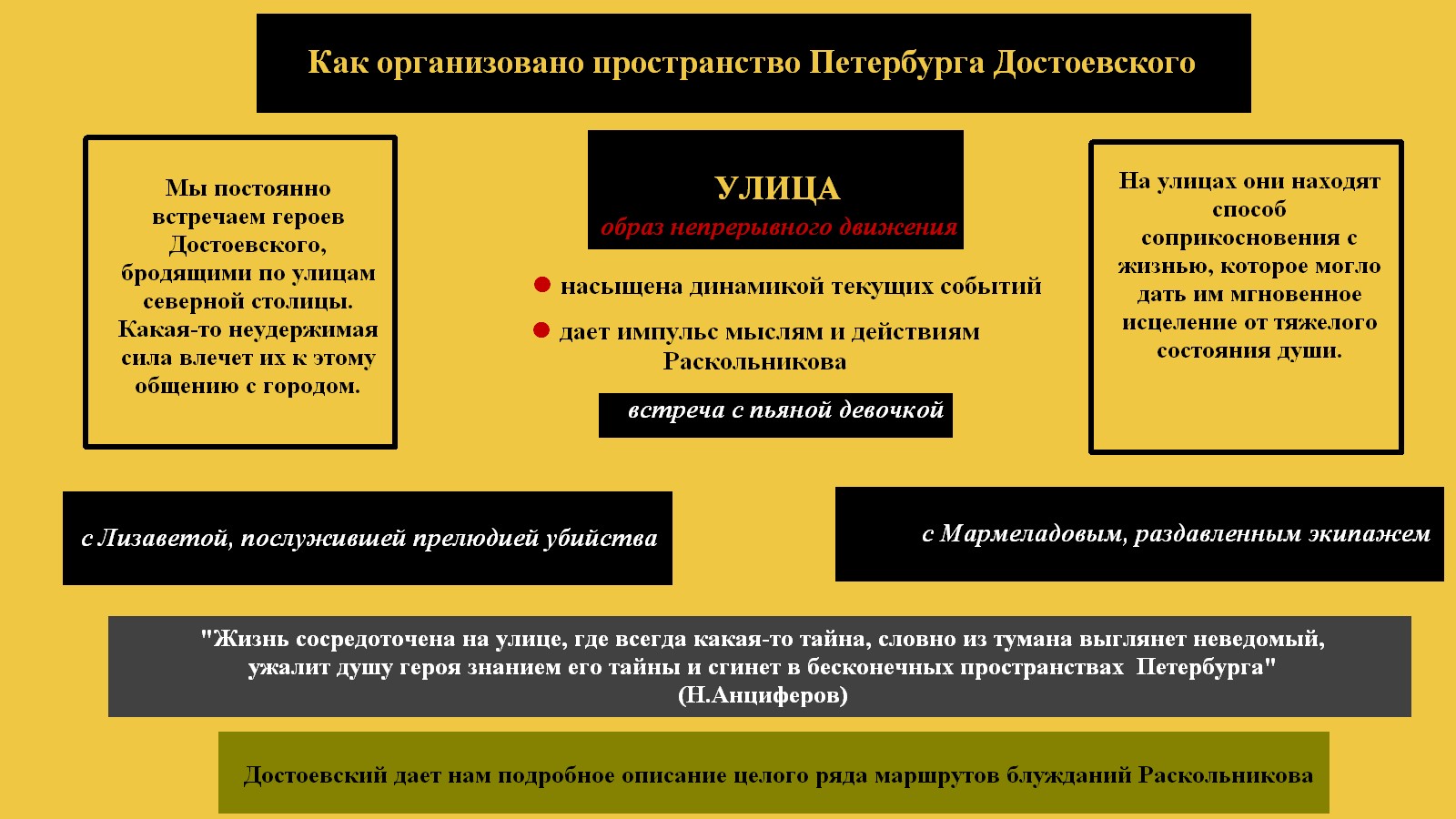 Десятиклассники приступают к изучению романа в третьей четверти. На дополнительных занятиях в нашем центре развития мы стараемся помочь ученикам в постижении сложного мира произведений Достоевского. Искусство медленного чтения ключевых глав «Преступления и наказания» поддерживается работой над слайдами, на которых в сжатом виде представлена информация, о которой шла речь на занятии. Тетрадь форматом А4 ПОСТЕПЕННО заполняется распечатками слайдов. Они становятся основой для устного или письменного высказывания ученика на данную тему.