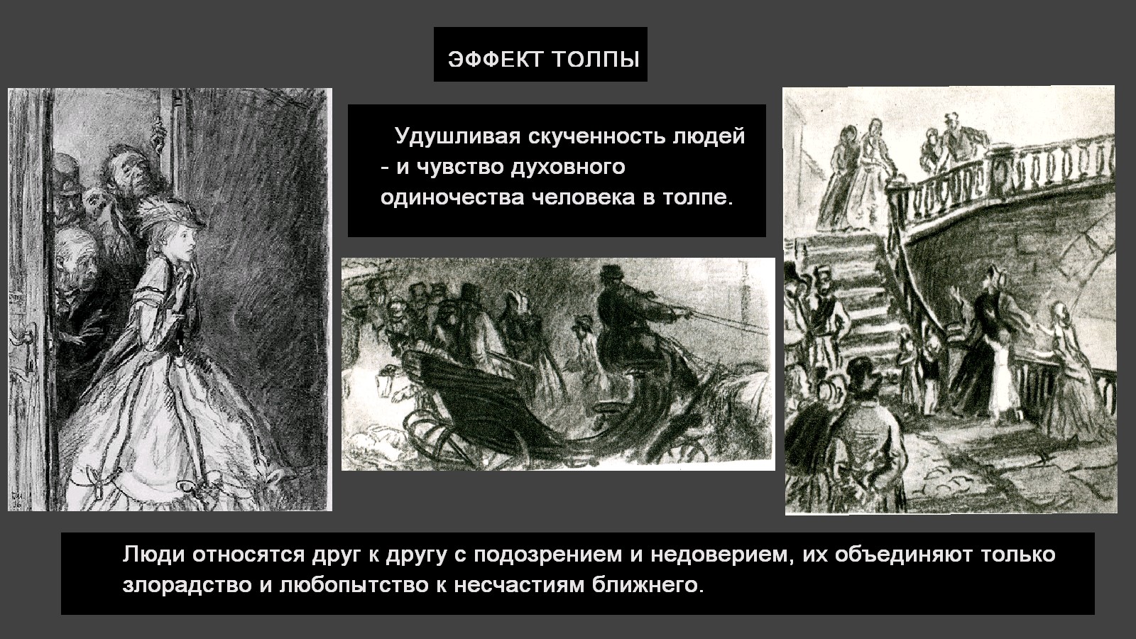 Почти все персонажи - «бывшие». Раскольников – бывший студент, Мармеладов – бывший чиновник, Соня – бывшая барышня, малыши Катерины Ивановны – бывшие дворянские дети. Нет ни одной целой семьи, почти все люди – осиротевшие обломки распавшихся семей. На бульварах, мостах, улицах Петербурга Достоевского непрерывно разворачиваются повседневные, а потому еще более чудовищные трагедии.