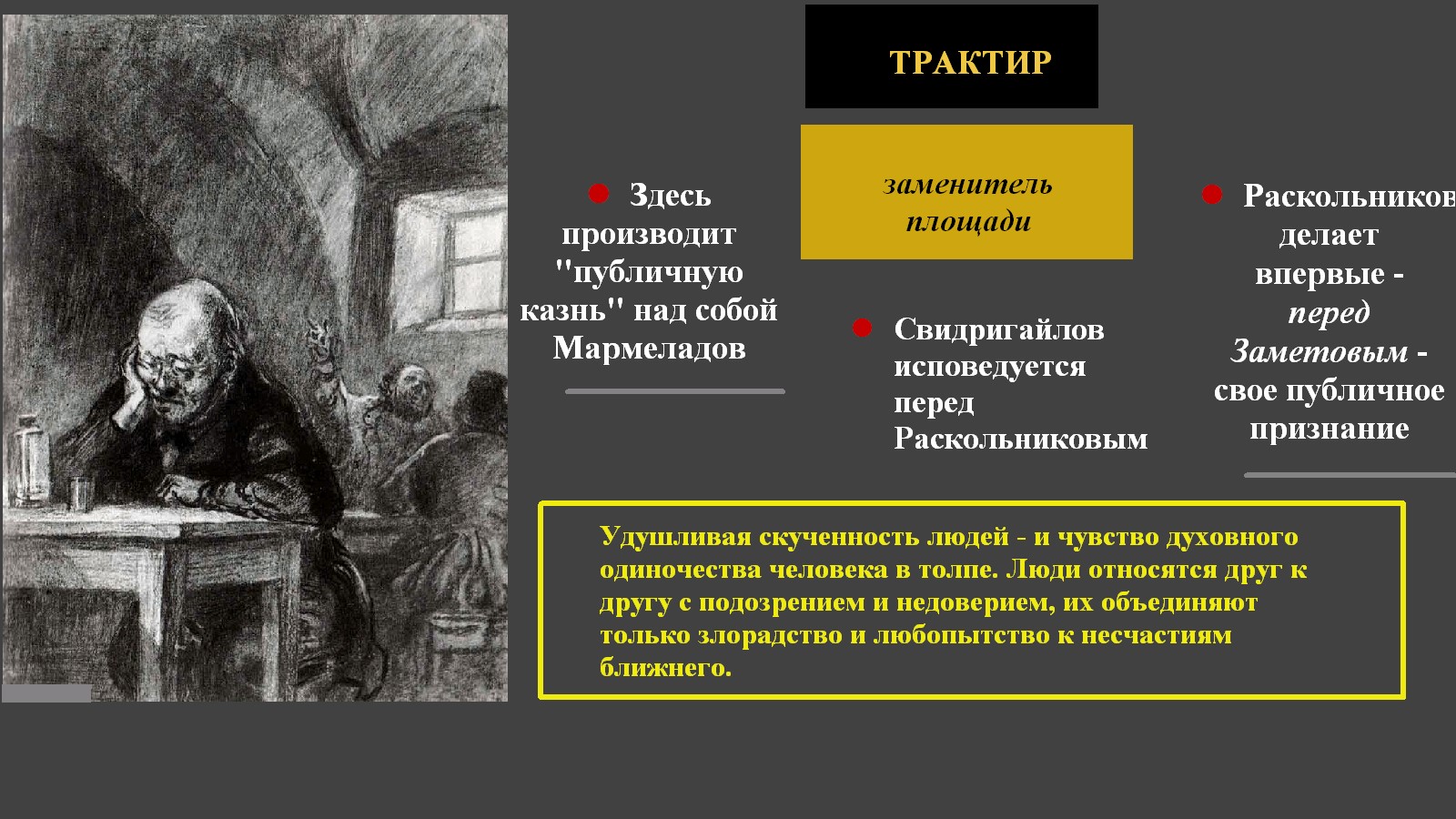 В трактире автор позволит Мармеладову рассказать всем – не только Раскольникову! – как и почему его дочь не могла не стать проституткой. «Для этого нужно было горькое, устремленное К предельному обнажению безысходности, проникнутое болью за человека дарование Достоевского. Такой степени обнажения горя, стыда и ужаса жизни человечества редко достигала мировая литература» (В.Б.Мураьев).