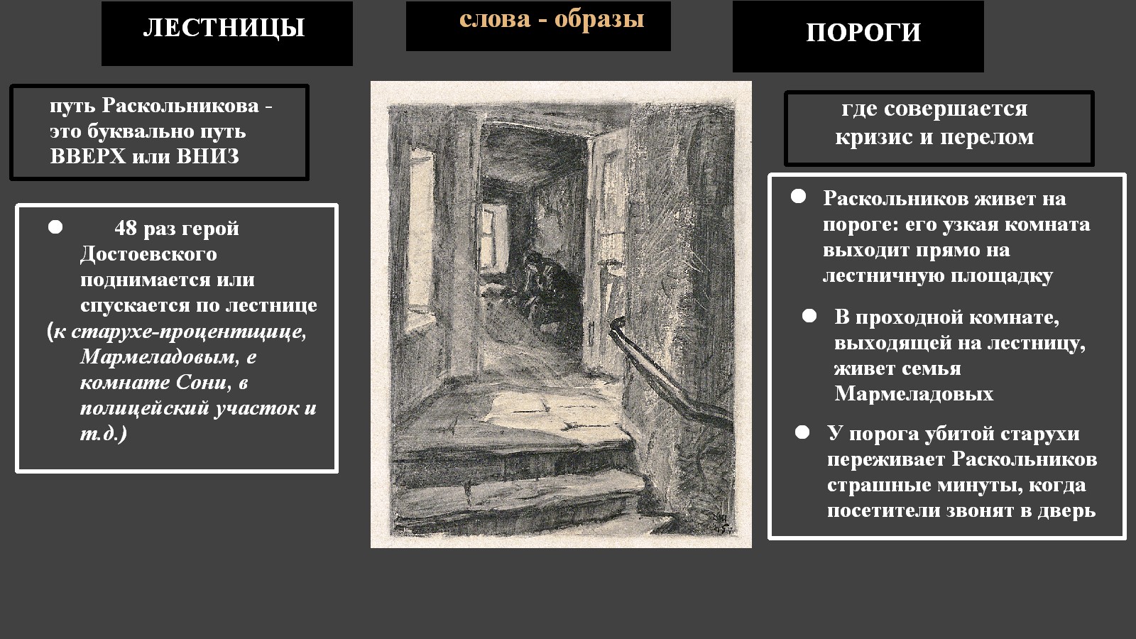 Порог, прихожая, лестничные площадки получают в романе значение точки, где совершается кризис. Раскольников живет буквально на пороге, поскольку его узкая комната выходит прямо на лестницу. Дверь он не запирает. В этом «гробу» нельзя жить – здесь можно принимать последние решения. На пороге – в проходной комнате, выходящей на лестничную клетку, - живет семья Мармеладовых. На пороге беседует с Соней, а по другую сторону их подслушивает Свидригайлов.