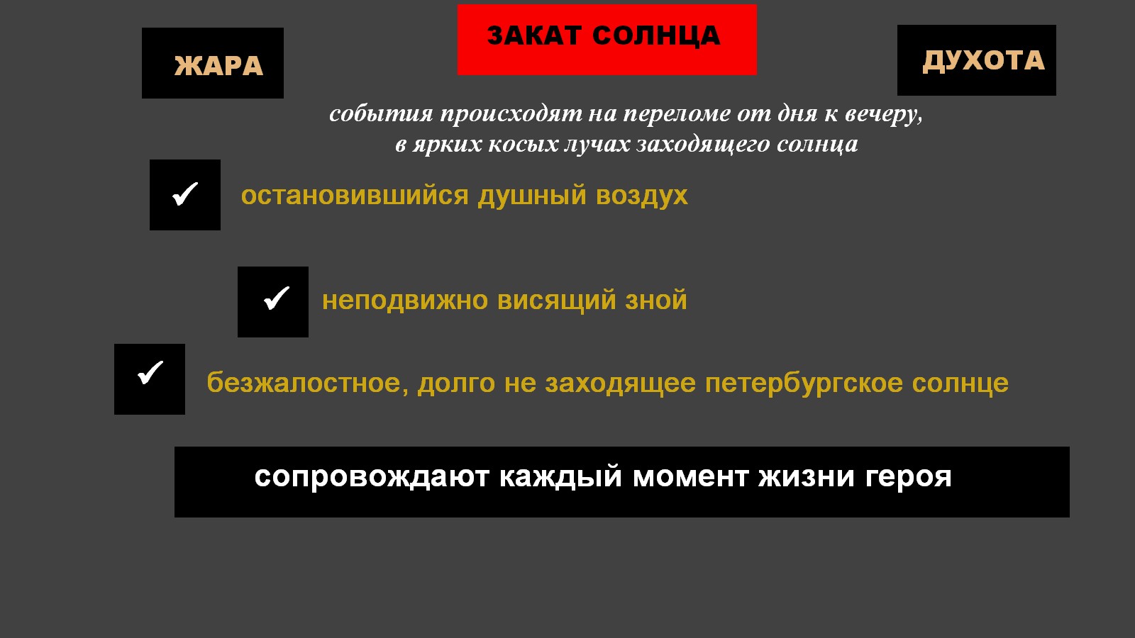 Заходящее солнце – постоянный образ романа, образ тревоги и смятения. Раскольников видит заходящее красное солнце во время своего пробного визита к старухе-процентщице. Снова и снова автор будет напоминать о невыносимой жаре и духоте. «А где тут воздухом дышать? Здесь и на улицах, как в комнатах без форточек».
