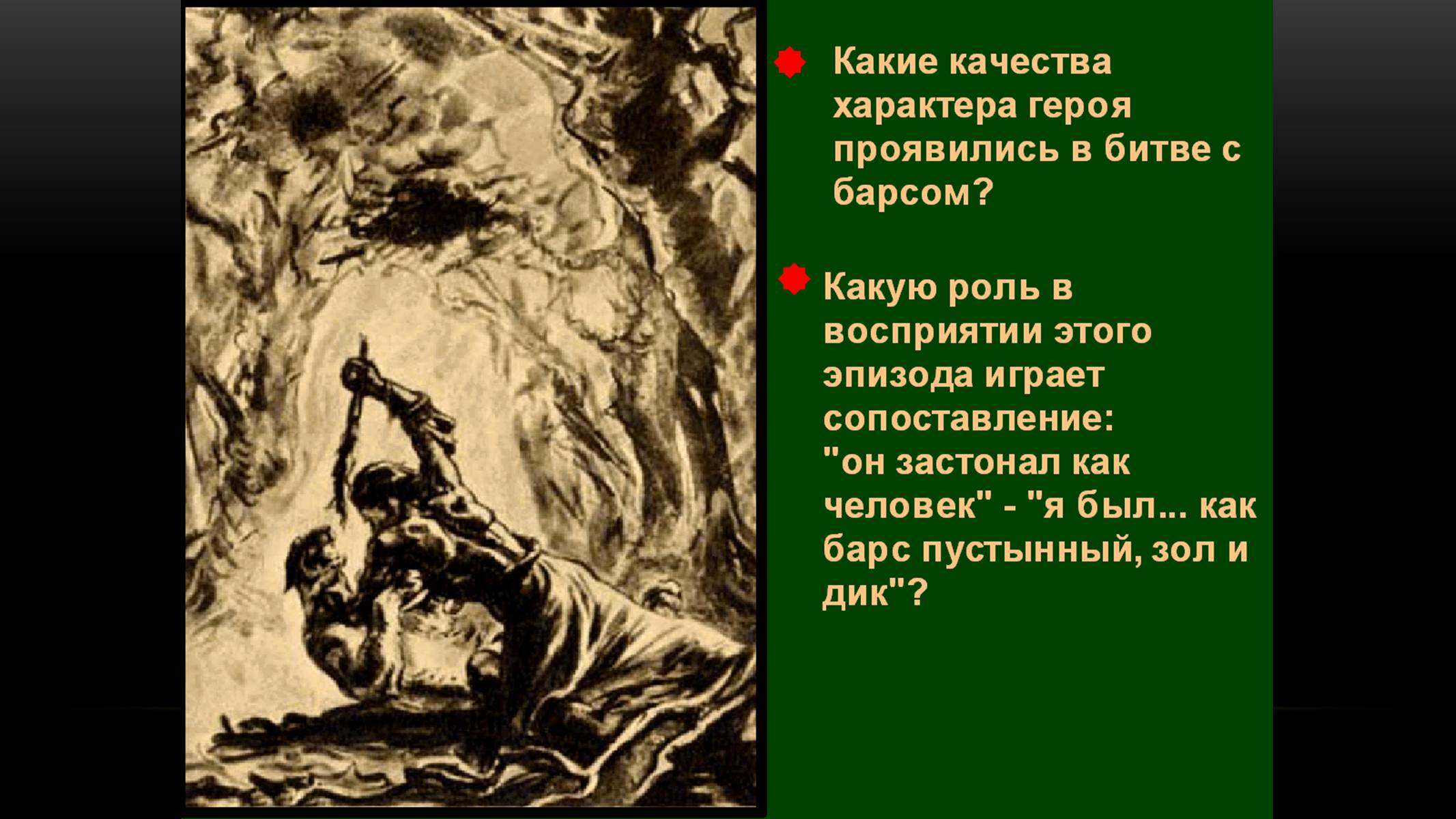 Центральный эпизод поэмы – бой с барсом. Это кульминация трех вольных дней героя. Каждый образ эпизода наполнен символическим значением.