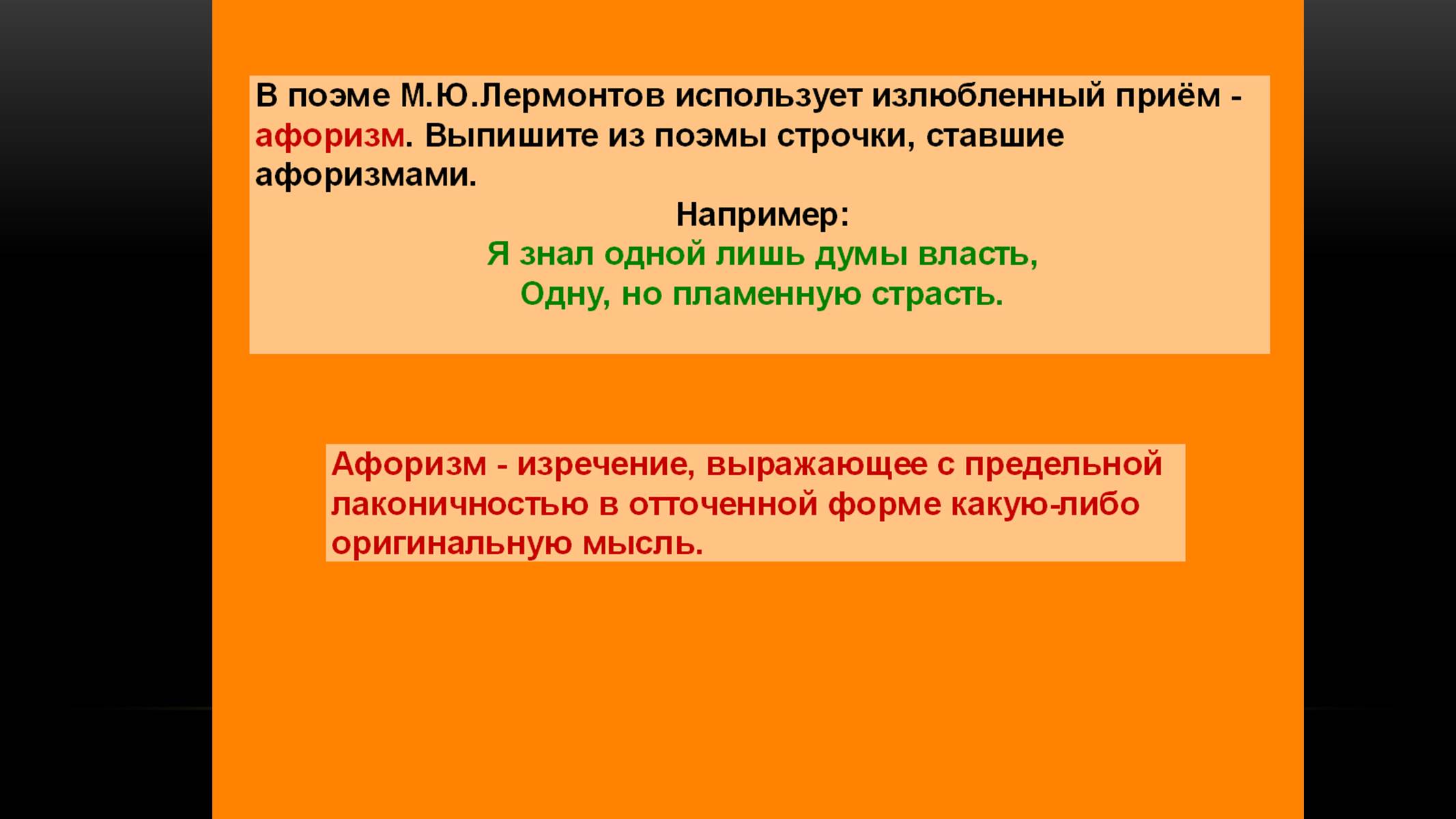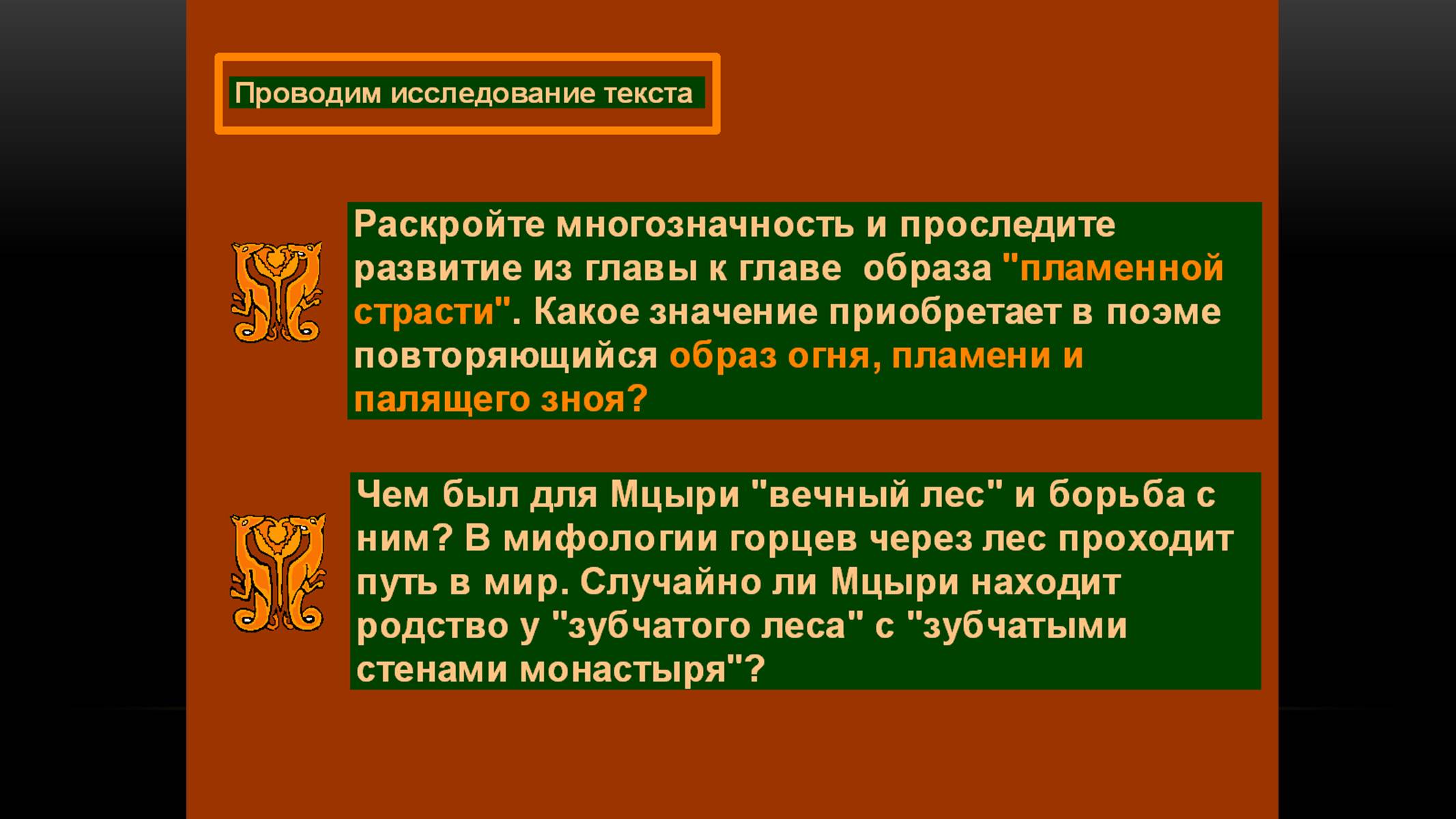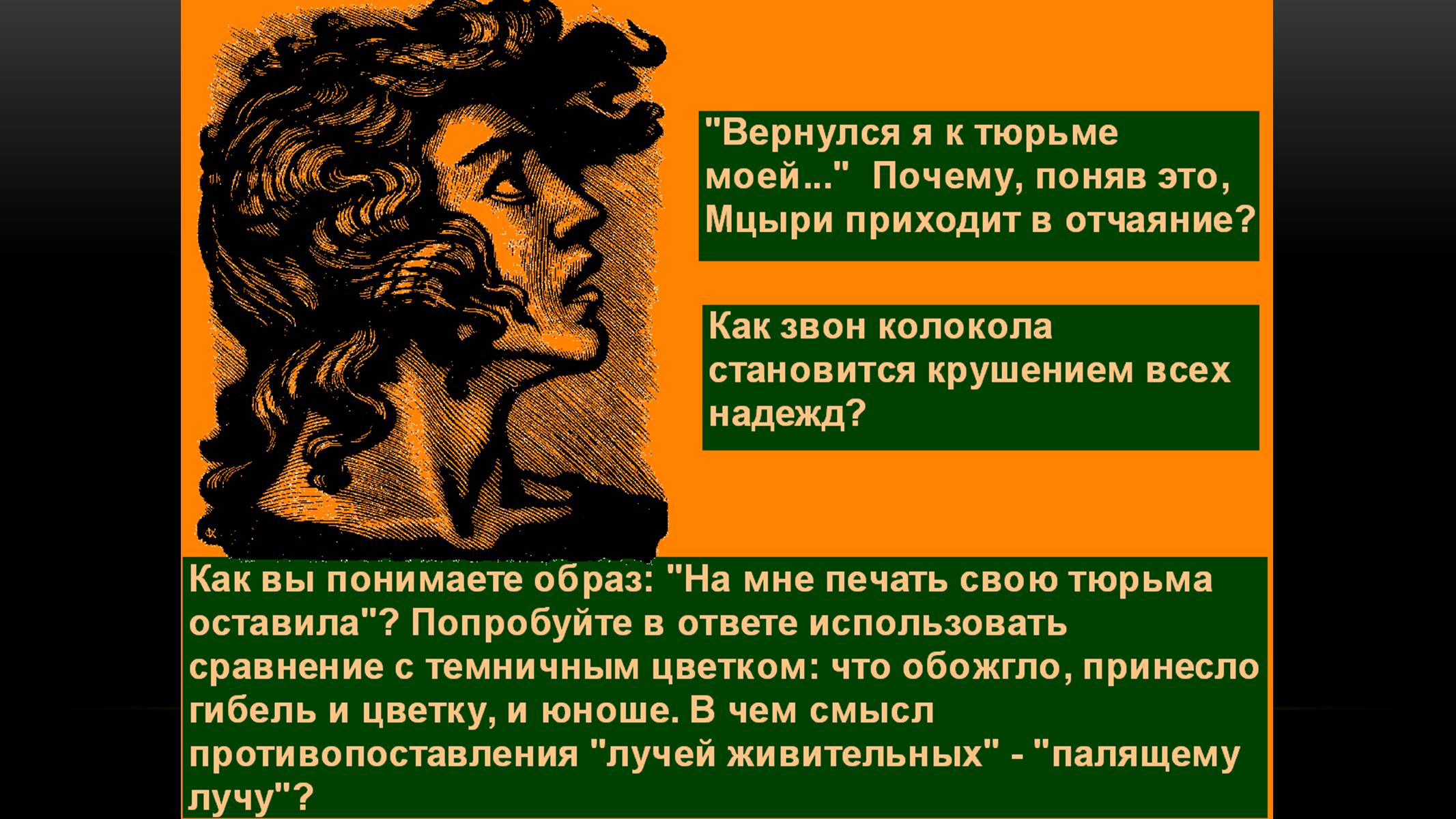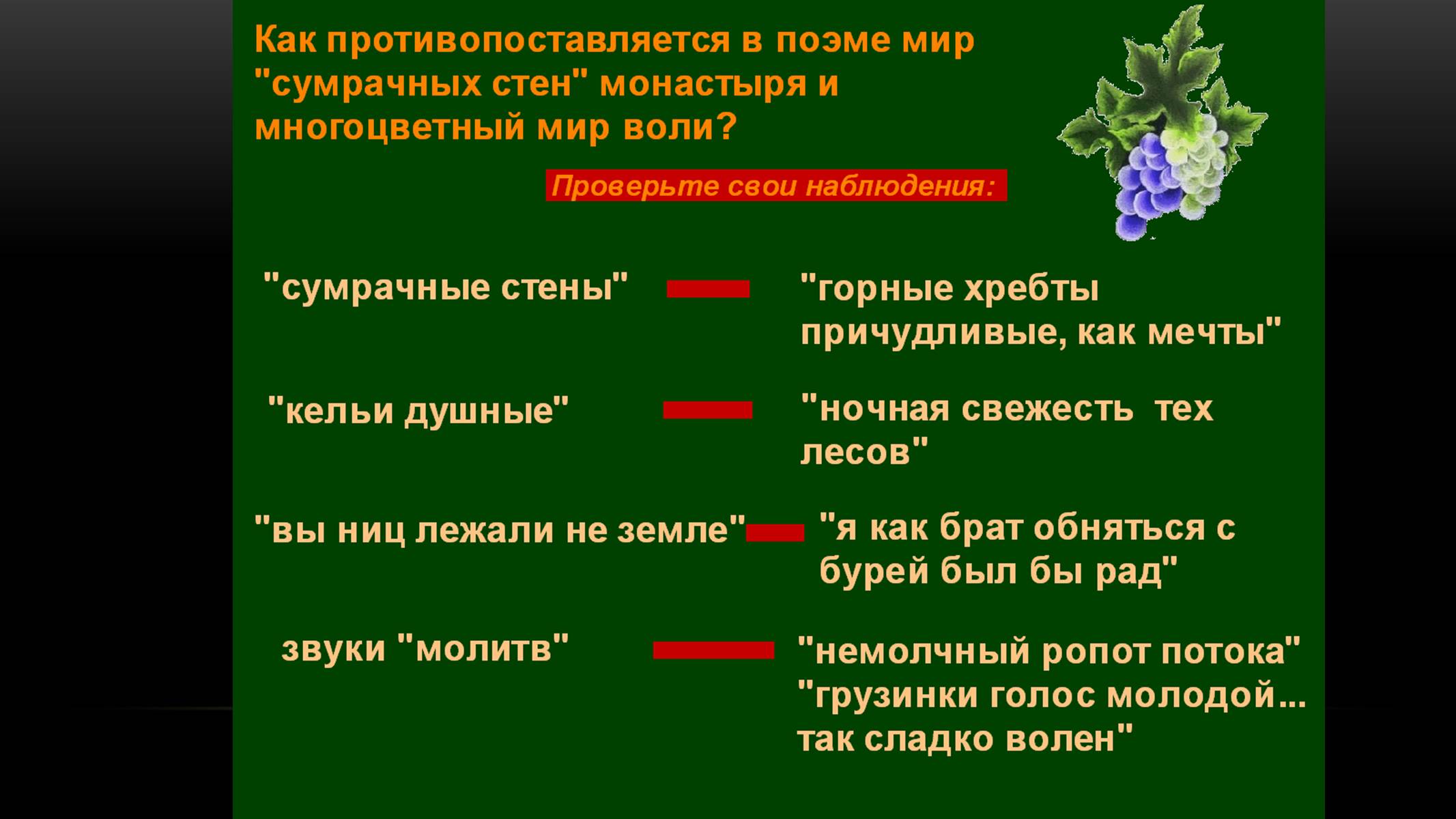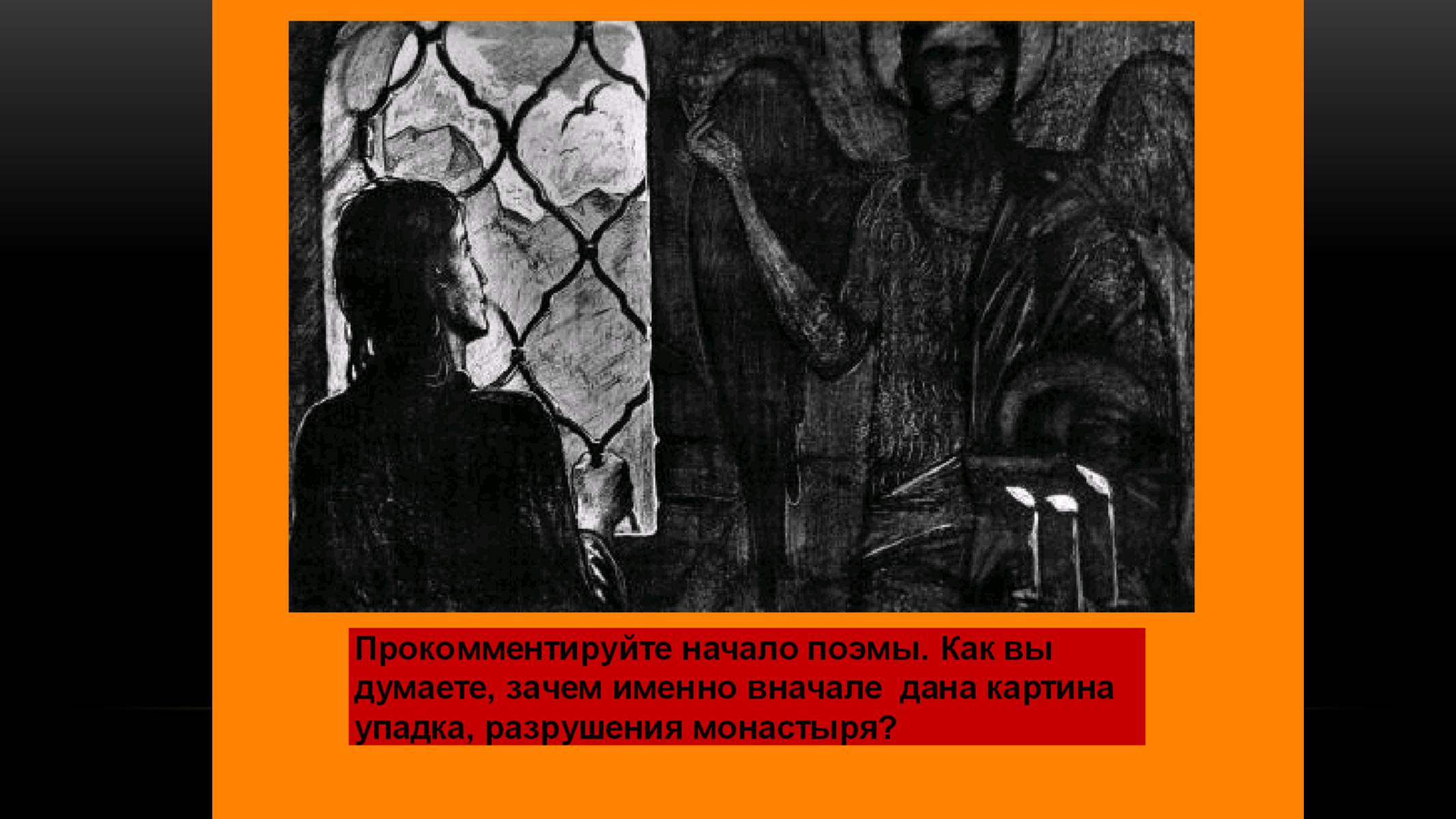 Слайд № 17 возвращает нас к началу поэмы. Теперь ученики смогут объяснить, почему поэма начинается с описания разрушенного монастыря. В чем символика его разрушения?