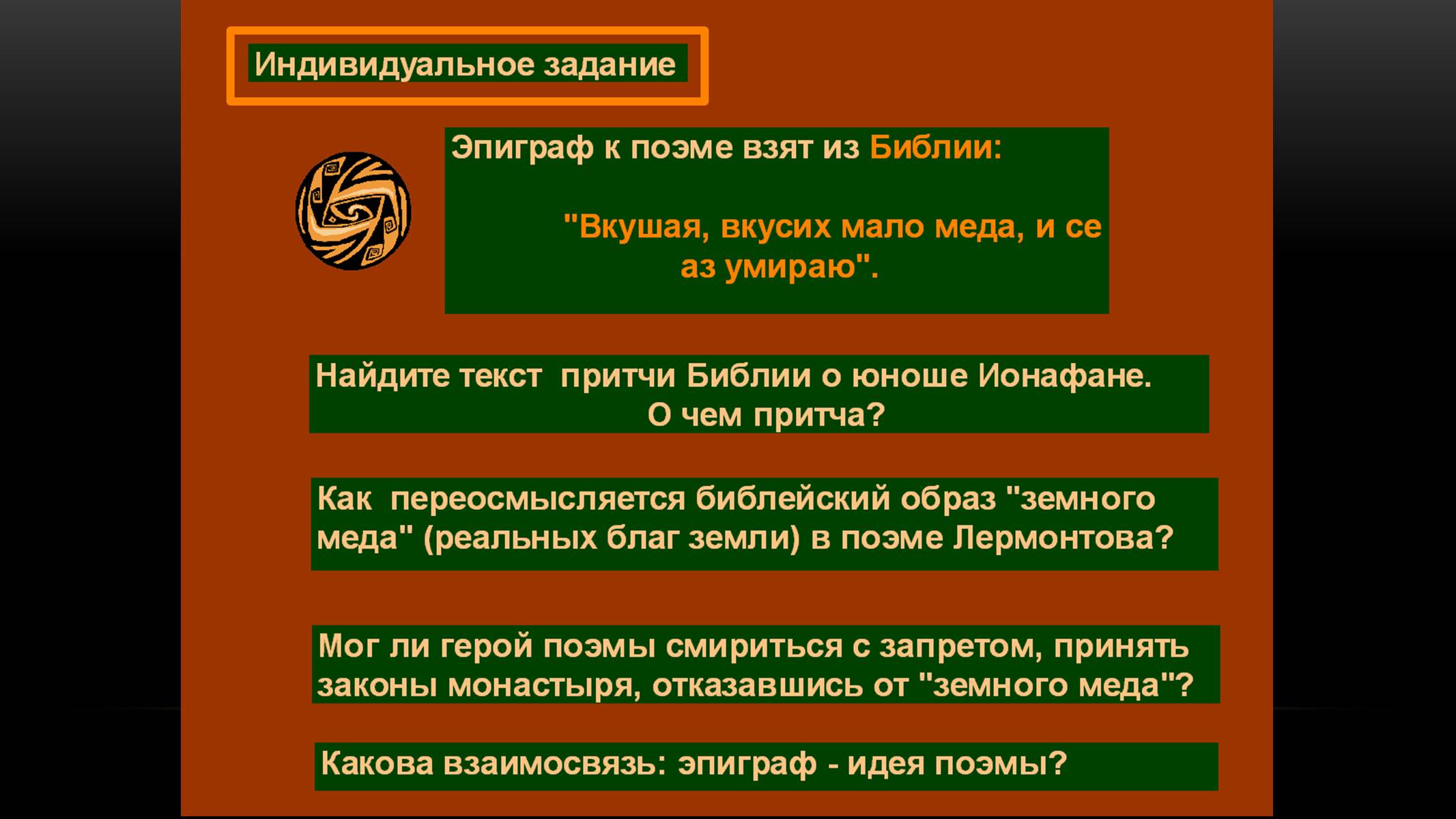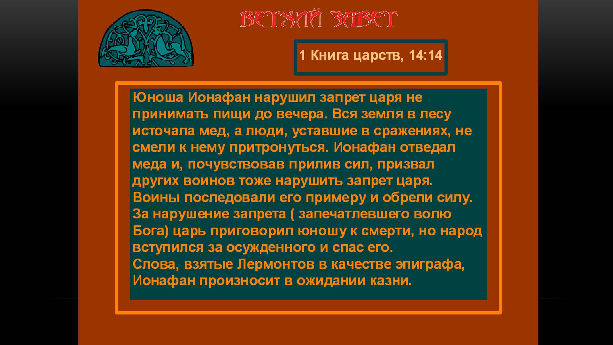 Слайды № 18-19 позволят расширить понимание культурологических аспектов поэмы, так как связаны с исследованием её эпиграфа, взятого из Библии.