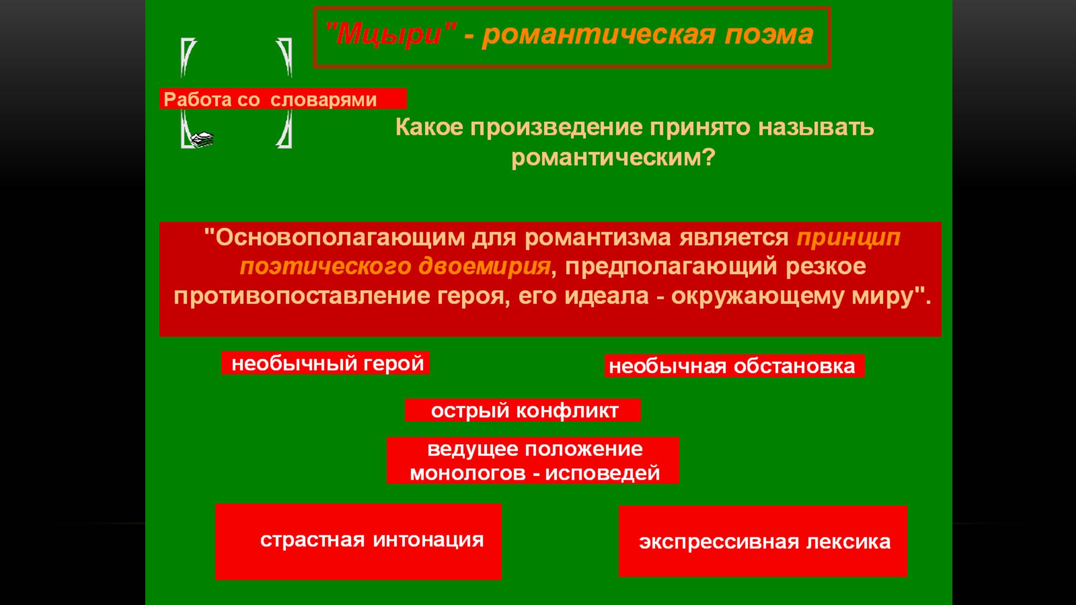 Правильное понимание жанрового своеобразия произведения, его принадлежность романтизму обогатит представление учеников, а литературоведческий материал, представленный в сжатой, но емкой форме, усваиваться легче.