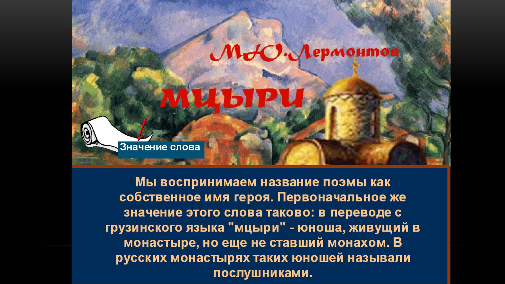 Слайд №4. Учимся работать с лексическим значением слова «Мцыри», что значительно расширяет детские представления о нем.