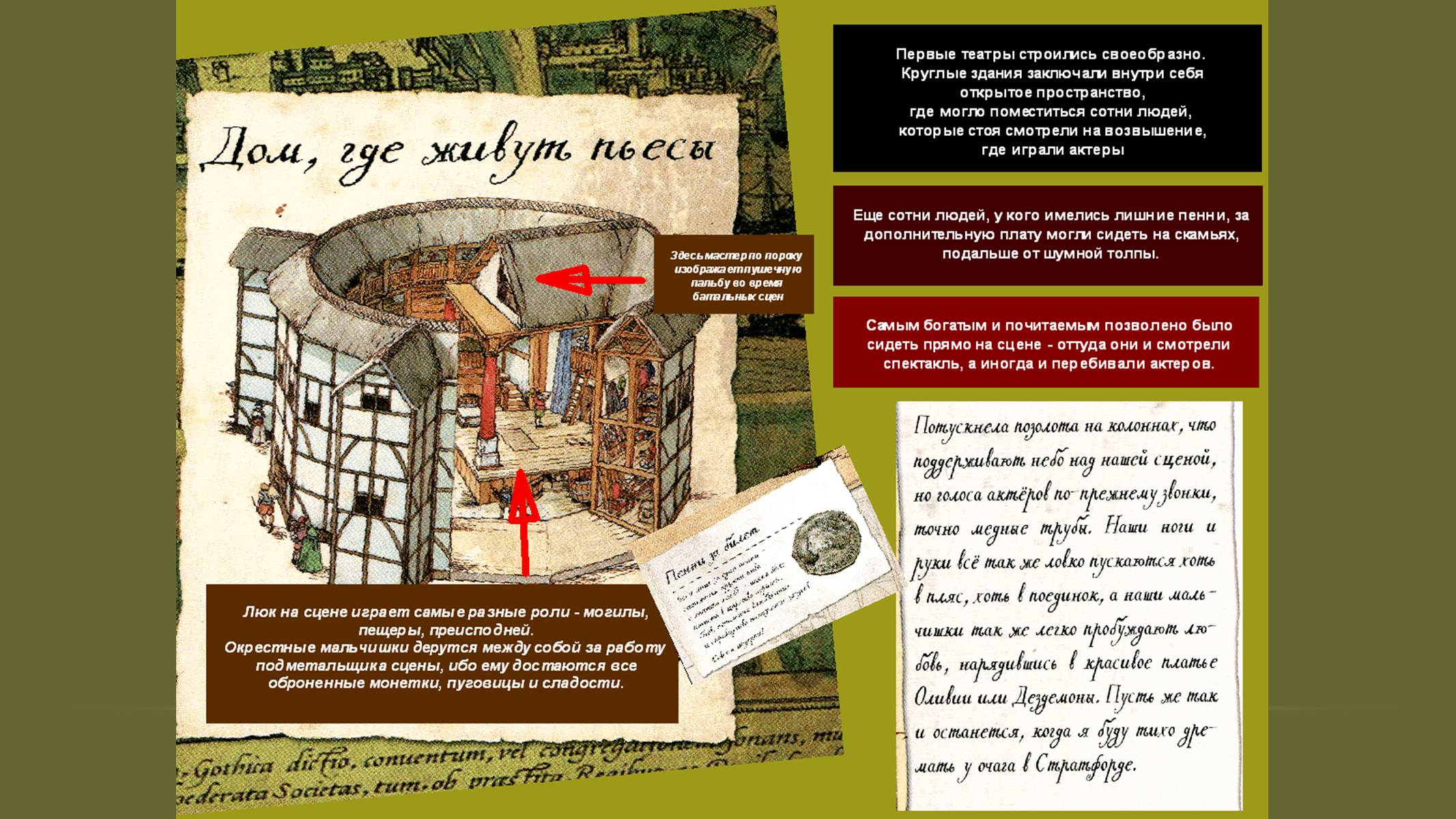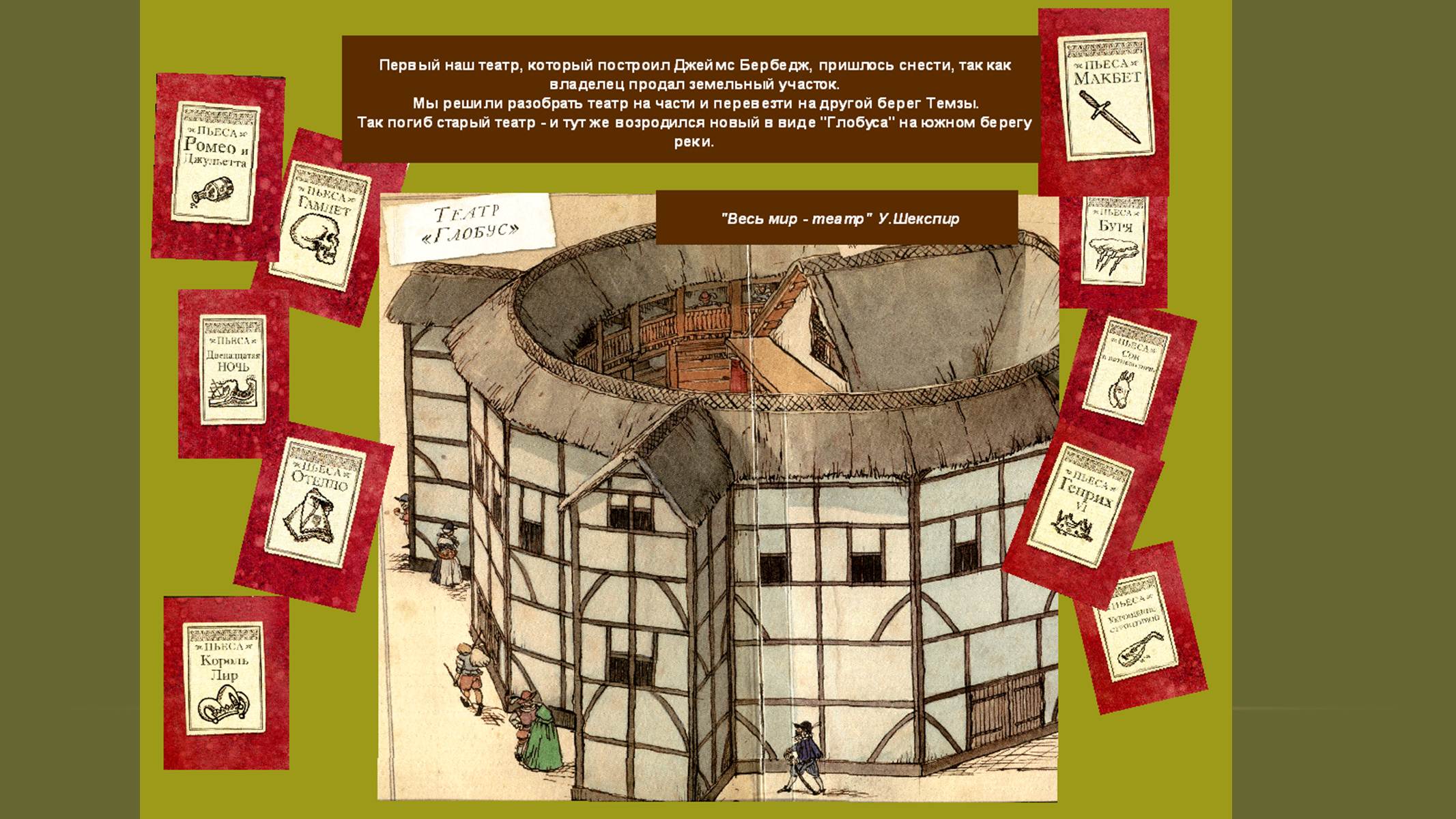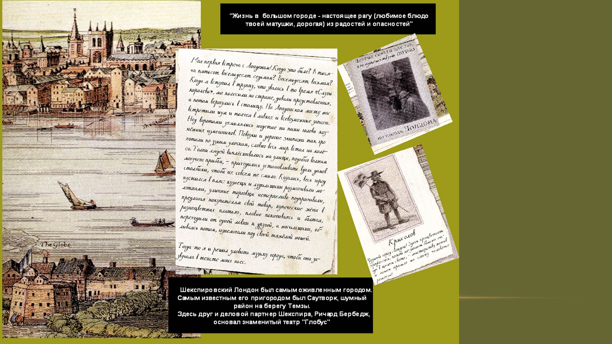 Следующая подборка слайдов (9- 14) посвящена первым впечатлениям от жизни в Лондоне, рассказывает историю создания знаменитого театра «Глобус», где будут жить пьесы драматурга. Слайды с 15 по 21 – об основной тематике и проблематике наиболее известных произведений Шекспира.