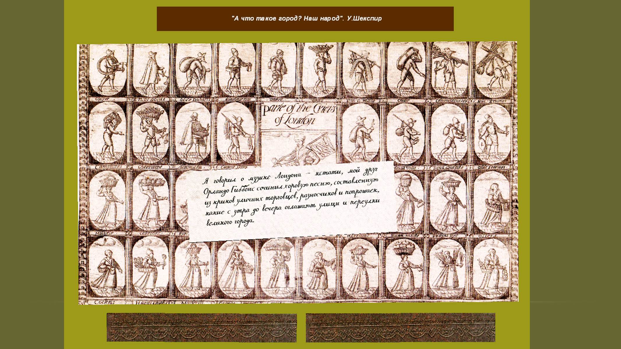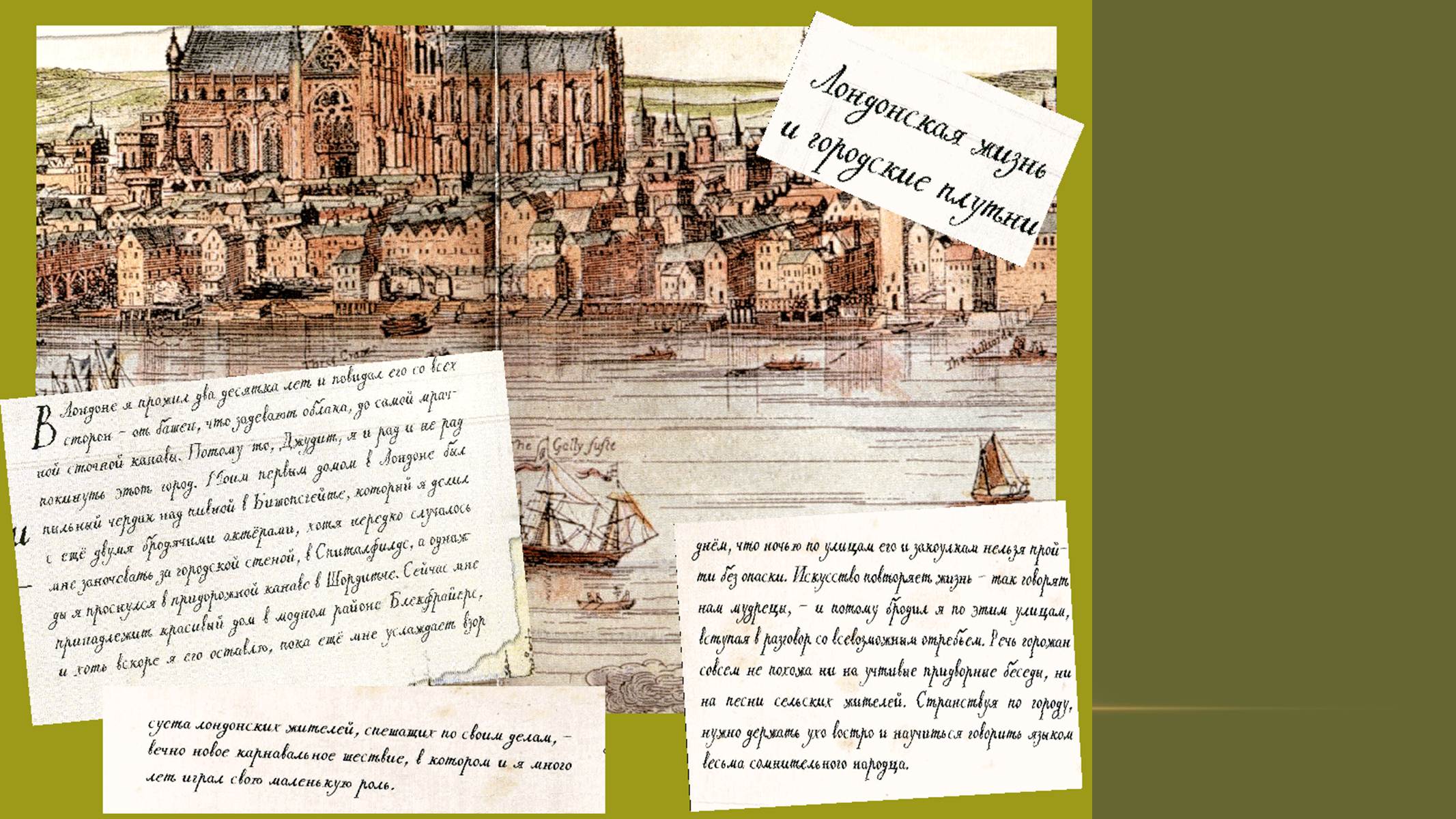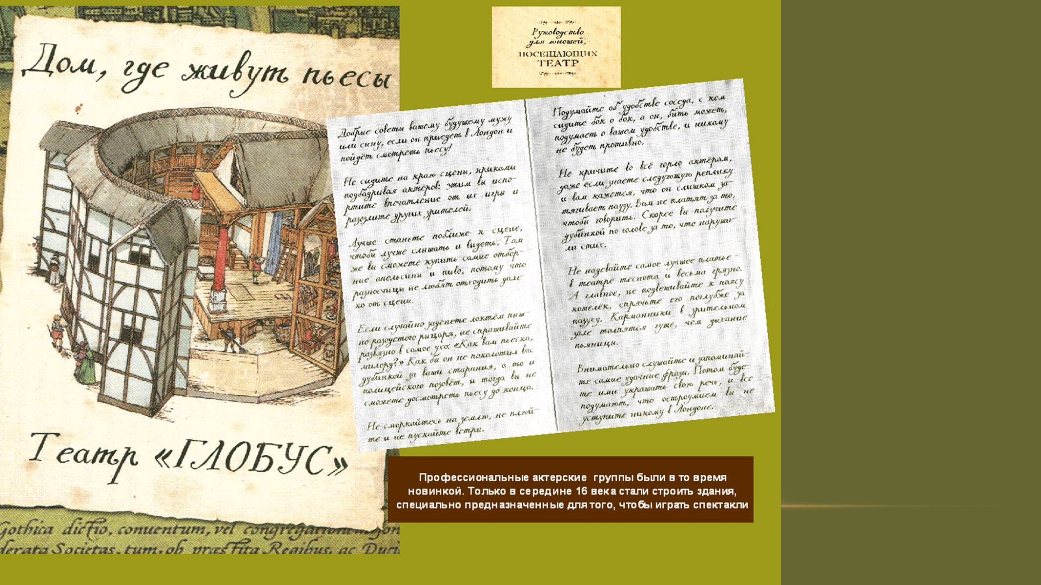 Следующая подборка слайдов (9- 14) посвящена первым впечатлениям от жизни в Лондоне, рассказывает историю создания знаменитого театра «Глобус», где будут жить пьесы драматурга. Слайды с 15 по 21 – об основной тематике и проблематике наиболее известных произведений Шекспира.