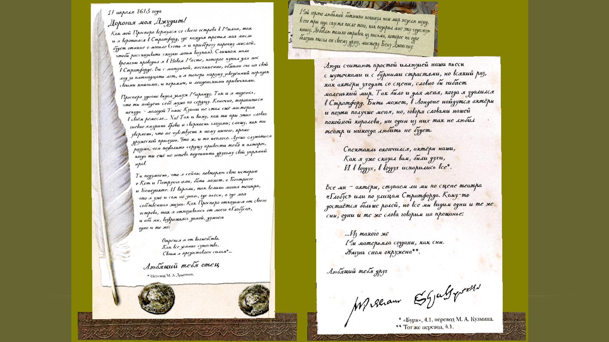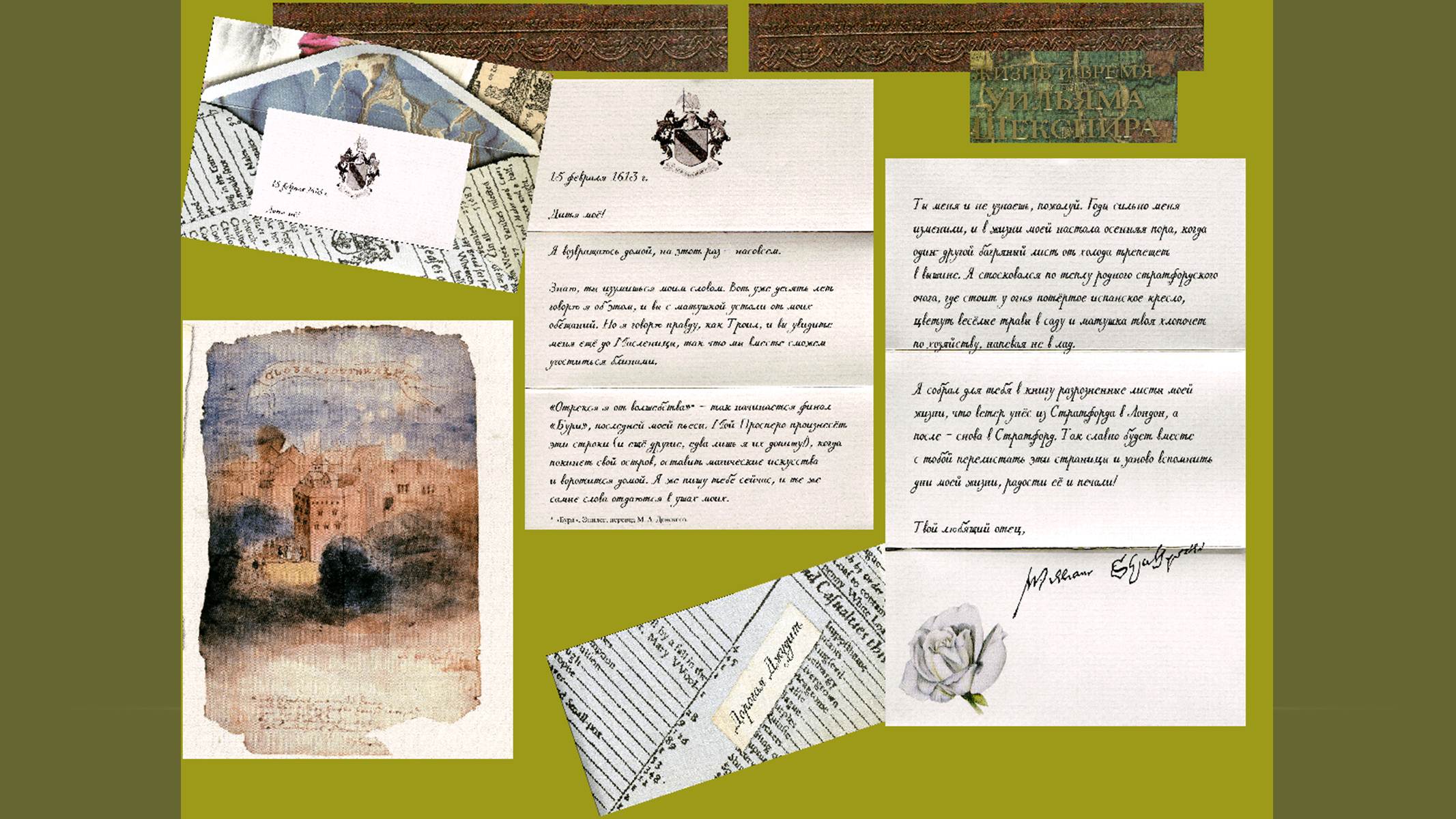 Перелистывая книгу, читатель погружается в далекие времена, ощущает дух эпохи, в которую жил и творил великий писатель. Её страницы позволяют увидеть истоки вдохновения Шекспира, проследить, как и что становилось предметом его творчества. Фрагменты воспоминаний, написанных писателем для дочери Джудит, которые включены авторами в канву повествования, во многом позволяют по-новому взглянуть на личность драматурга и перипетии его жизни. Получилось своеобразное путешествие во времени и пространстве. Знакомство с книгой, имеющей подзаголовок «Повесть о джентльмене и поэте, рассказанная его собственными словами», будет полезно всем: и детям, и взрослым.