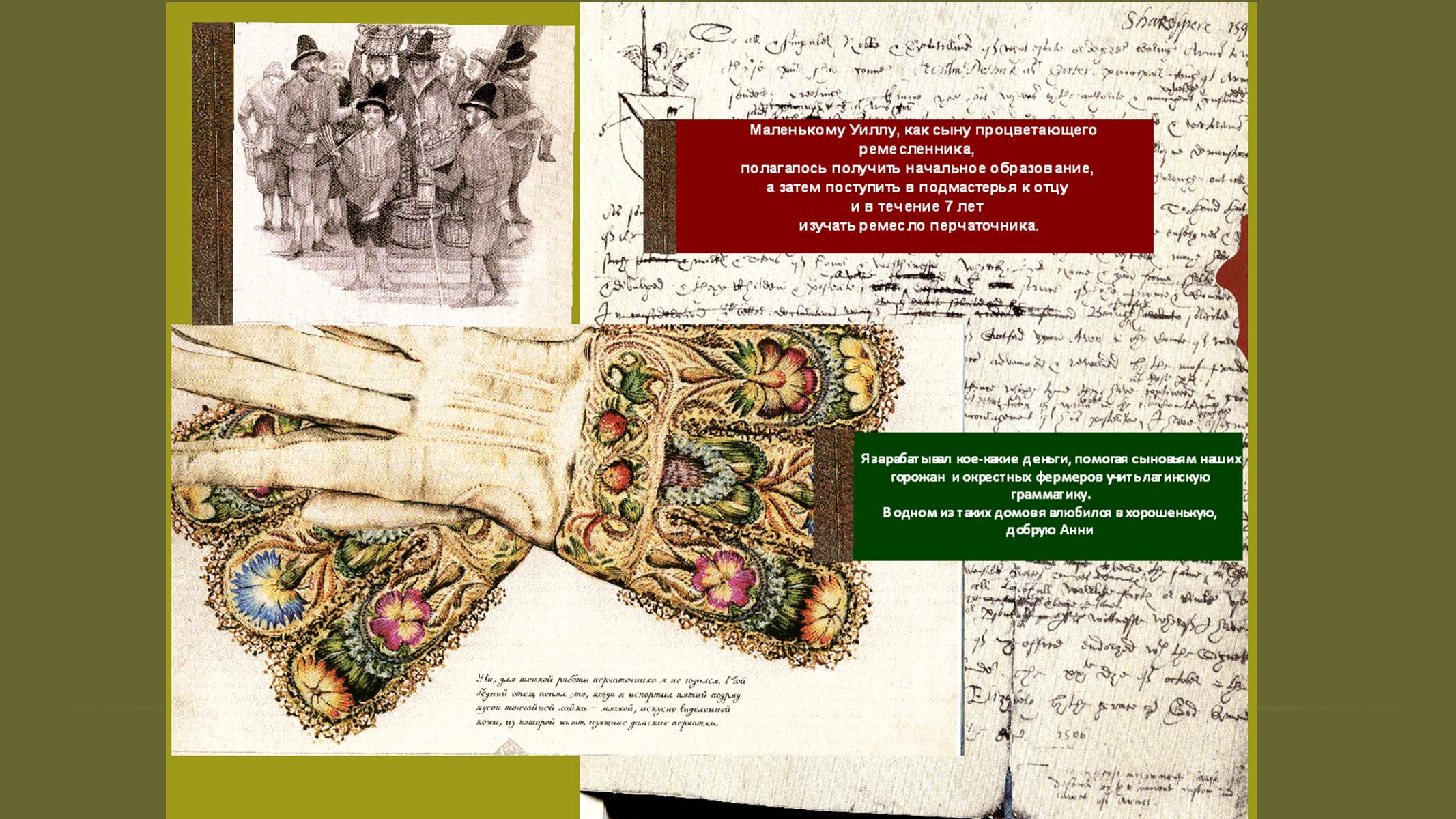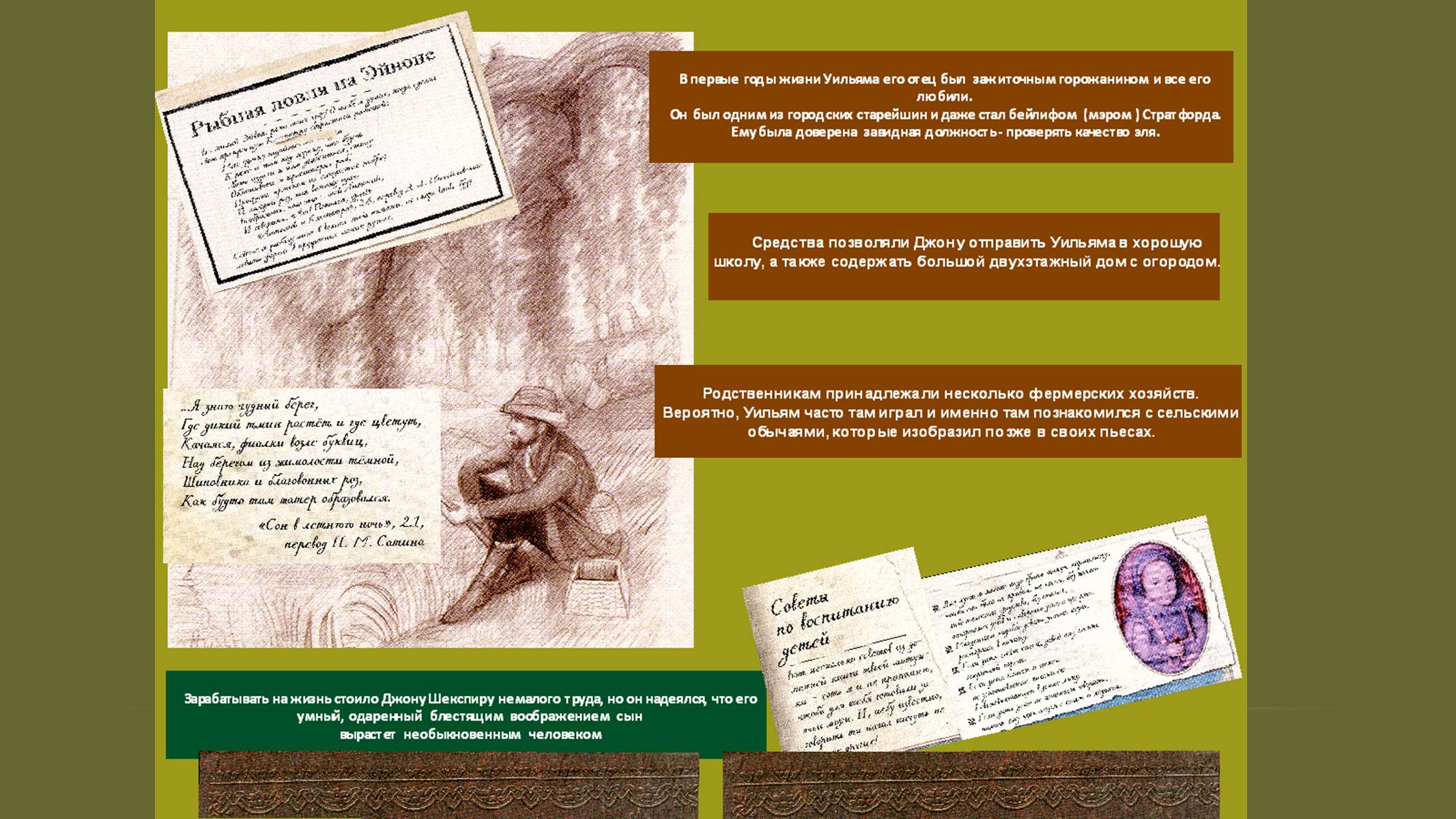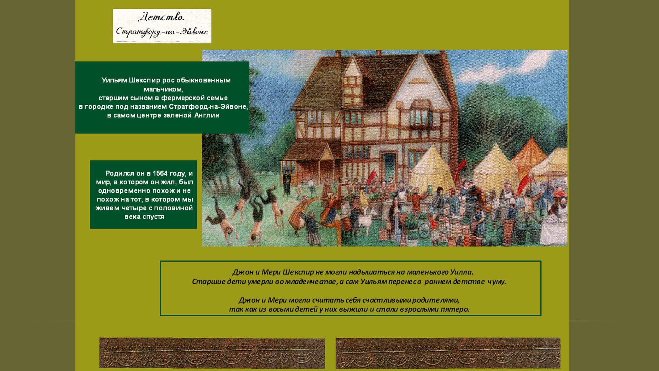 Первые страницы презентации (1-8) позволят переместиться в Стратфорд-на-Эйвоне и узнать интересные факты из воспоминаний писателя о семье, детстве, как получал первое образование, осваивал профессию перчаточника и женился. Приведены размышления Шекспира о том, как сложилась его семейная жизнь с Анной Хетеуэй и почему он покинул родной город.