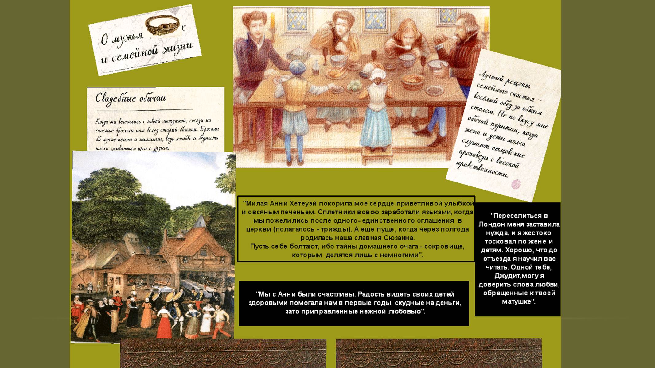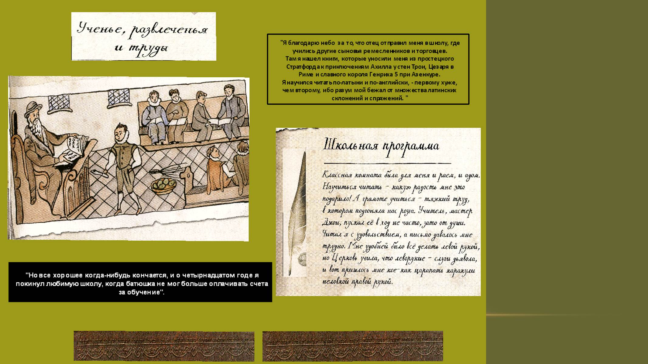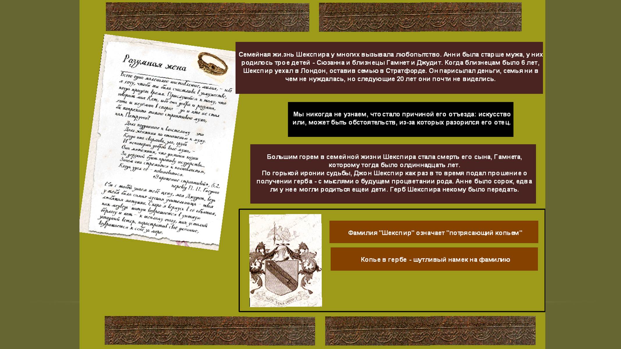 Первые страницы презентации (1-8) позволят переместиться в Стратфорд-на-Эйвоне и узнать интересные факты из воспоминаний писателя о семье, детстве, как получал первое образование, осваивал профессию перчаточника и женился. Приведены размышления Шекспира о том, как сложилась его семейная жизнь с Анной Хетеуэй и почему он покинул родной город.