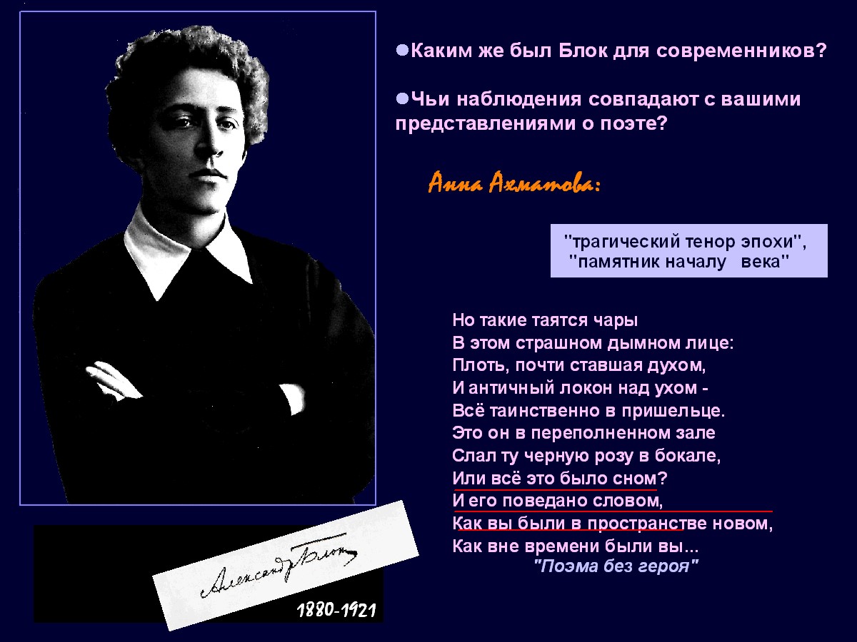 Точные высказывания выдающихся современников А.Блока - А.Ахматовой, Б.Пастернака – обогатят представления школьников о поэте.