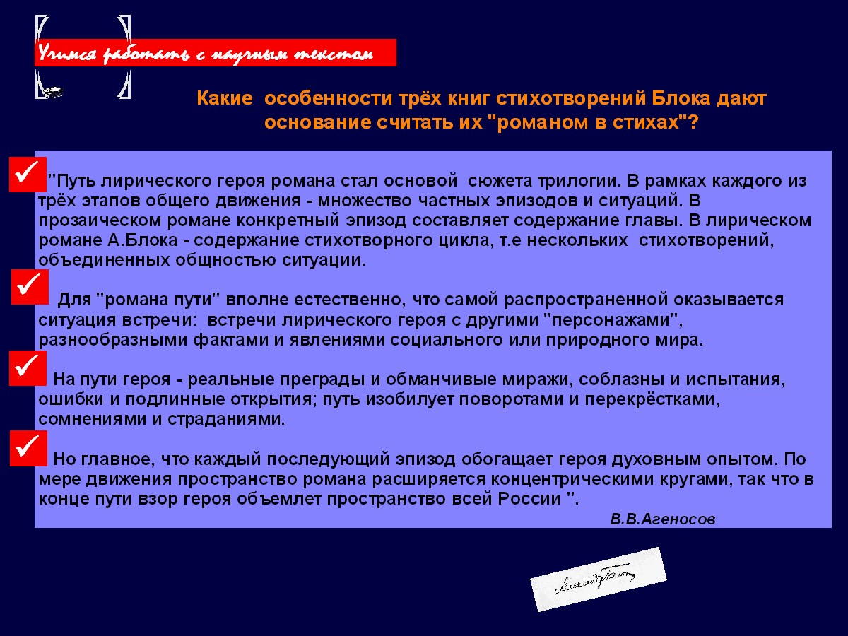 А.Блок – один из сложнейших поэтов. Чтобы по-настоящему понять его, нужно прочувствовать каждое стихотворение, включенное в цикл, серьезно вдуматься в скрытый смысл, увидеть своеобразие поэтической манеры гениального поэта.