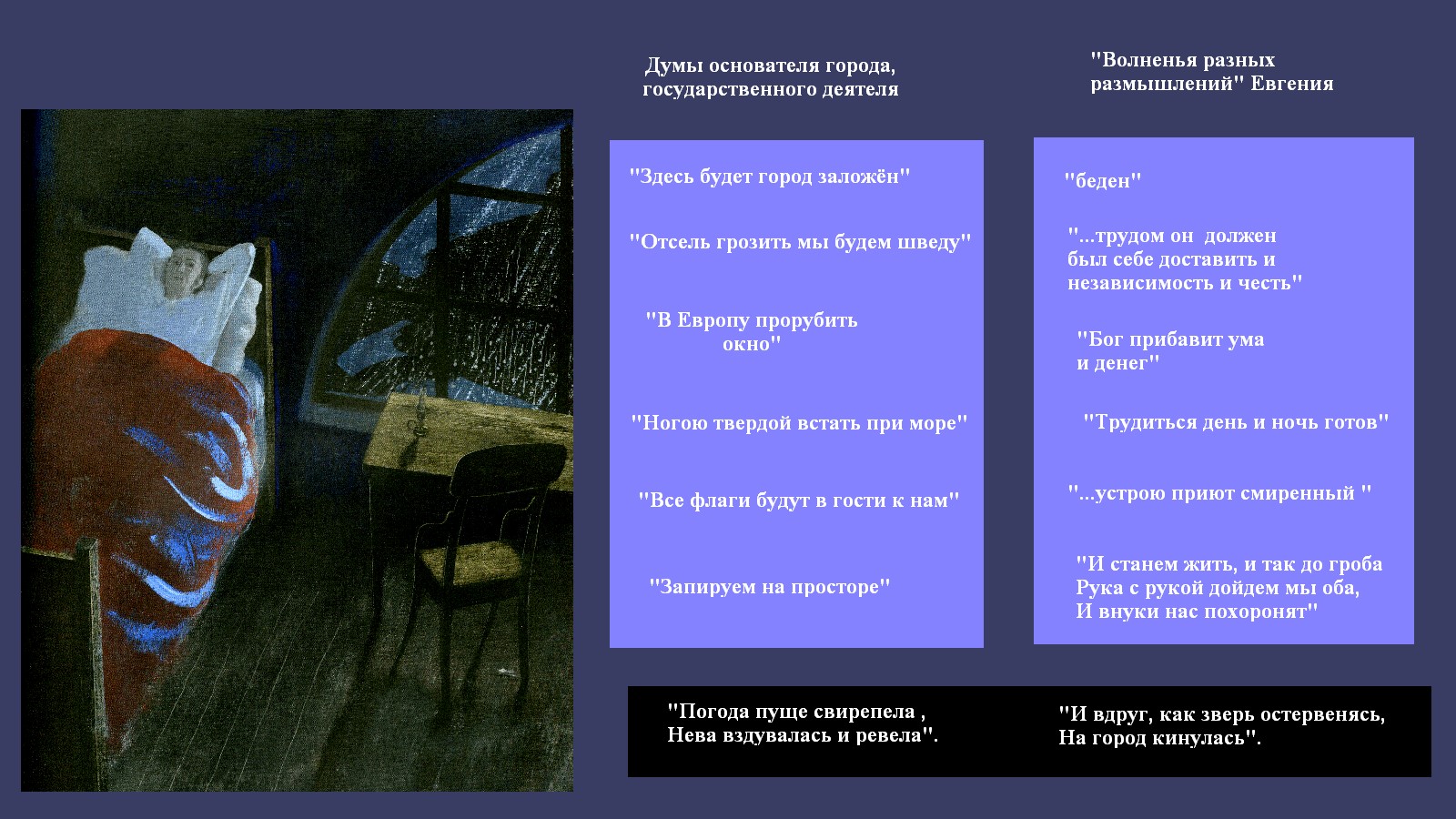 Удивительна архитектоника произведения. Поэма начинается с устремленных вдаль дум Петра Великого. А в первой части автор знакомит нас с мечтами Евгения, находящегося в самом низу той властной вертикали, что и была построена в соответствии с планами императора.