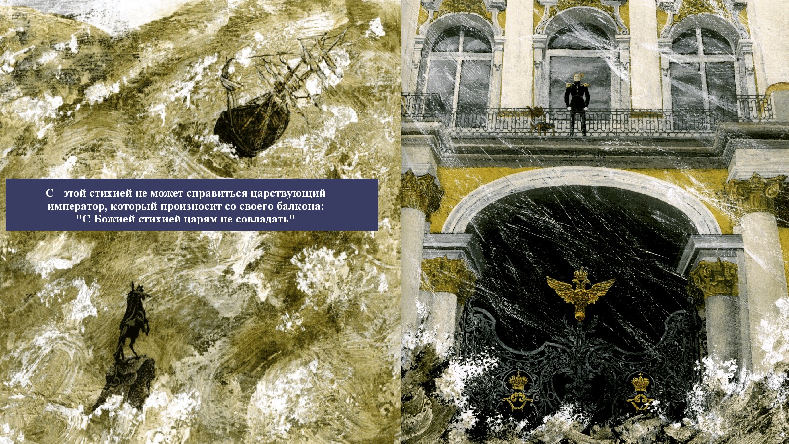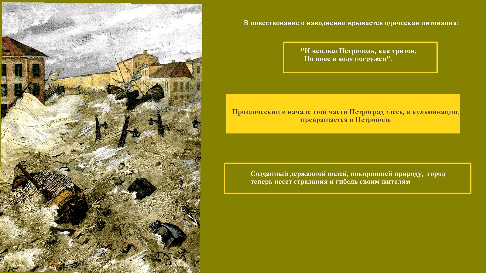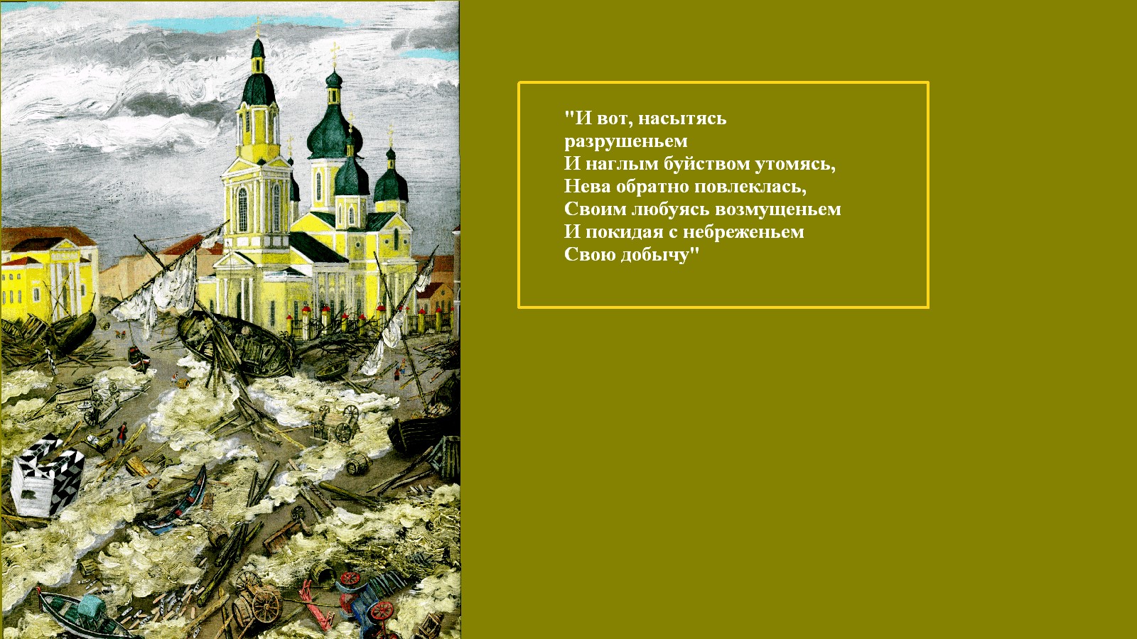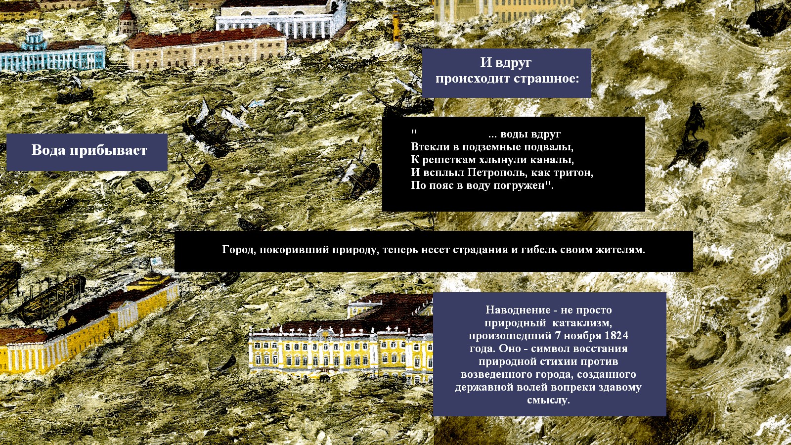 Нева под напором морских волн становится диким зверем, бросающимся на Петербург, грабит, разрушает и убивает. Ее «державное теченье» превращается в гневную бурю, а город – в поле сражения, заваленное трупами и обломками.